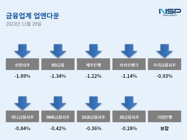 (서울=NSP통신) 강수인 기자 = 29일 코스피(-0.08%)와 코스닥(+0.73%)은 하락과 상승이 엇갈렸다. 이 가운데 은행주는 전거래일 대비 1.11% 하락했다. 은행주는 11종목 가운데 1종목이 상승, 9종목이 하락했다. 보합세는 1종목이다.