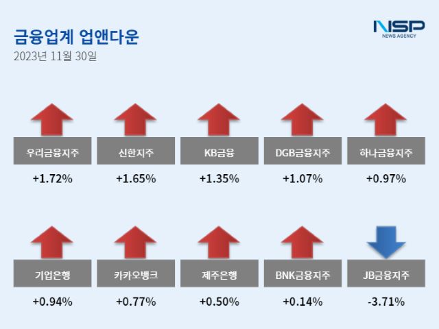 (서울=NSP통신) 강수인 기자 = 30일 코스피(+0.61%)와 코스닥(+1.12%)은 모두 상승했다. 이 가운데 은행주는 전거래일 대비 1.12% 상승했다. 은행주는 11종목 가운데 9종목이 상승, 2종목이 하락했다.