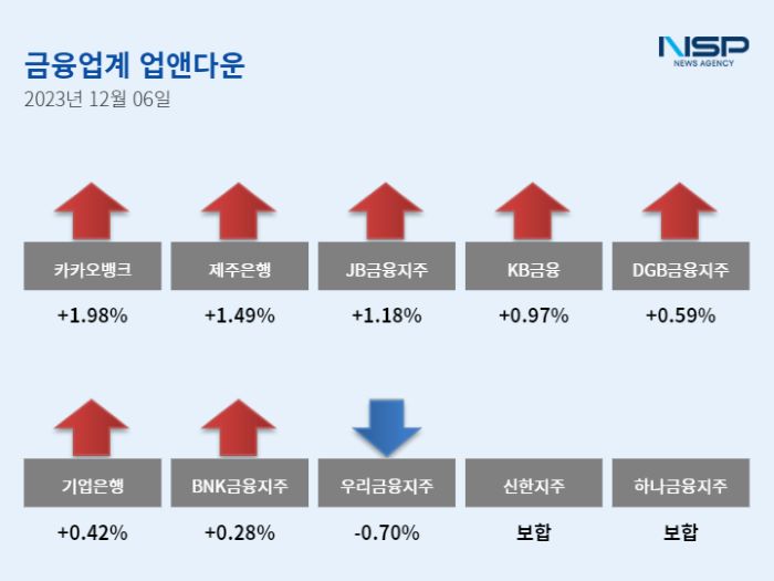 (서울=NSP통신) 강수인 기자 = 6일 코스피(+0.04%)와 코스닥(+0.76%)은 모두 상승했다. 이 가운데 은행주는 전거래일 대비 0.51% 상승했다. 은행주는 11종목 가운데 7종목이 상승, 2종목이 하락했다. 보합세는 2종목이다.