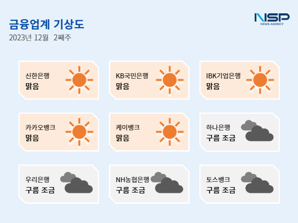 (서울=NSP통신) 강수인 기자 = 2023년 12월 2주차 금융업계 기상도는 신한은행·IBK기업은행·카카오뱅크·케이뱅크 KB국민은행의 ‘맑음’, 하나은행·우리은행·NH농협은행·토스뱅크의 ‘구름조금’으로 기록됐다.
