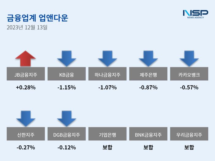 (서울=NSP통신) 강수인 기자 = 13일 코스피(-0.97%)와 코스닥(-1.22%)은 모두 하락했다. 이 가운데 은행주는 전거래일 대비 0.54% 하락했다. 은행주는 11종목 가운데 2종목이 상승, 6종목이 하락했다. 보합세는 3종목이다.