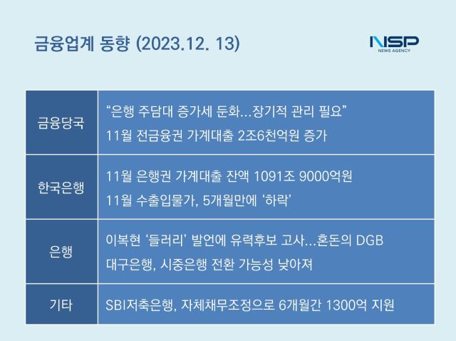 (서울=NSP통신) 강수인 기자 = 차기 CEO(최고경영자) 선임 중인 DGB금융그룹에 큰 변동이 생겼다. 이복현 금융감독원장의 ‘들러리’ 발언과 함께 유력한 후보로 거론됐던 허인 전 KB금융그룹 부회장이 불참 의사를 밝힌 것. 내부출신 후보자도, 외부출신 후보자도 마음을 놓을 수 없는 상황이다. 한편 은행권 가계대출 잔액이 1091조를 넘어선 것으로 나타났다. 역대 최대 규모다.