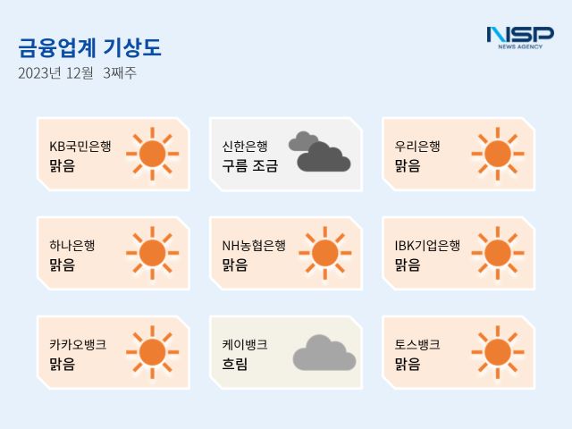 (서울=NSP통신) 강수인 기자 = 2023년 12월 3주차 금융업계가상도는 KB국민은행·하나은행·우리은행·NH농협은행·IBK기업은행·카카오뱅크·토스뱅크의 ‘맑음’, 신한은행의 ‘구름조금’, 케이뱅크의 ‘흐림’으로 기록됐다.