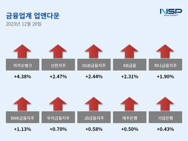 (서울=NSP통신) 강수인 기자 = 20일 코스피(+1.78%)와 코스닥(+0.55%)은 모두 상승했다. 이 가운데 은행주는 전거래일 대비 2.14% 상승했다. 은행주는 11종목 가운데 10종목이 상승, 1종목이 하락했다.