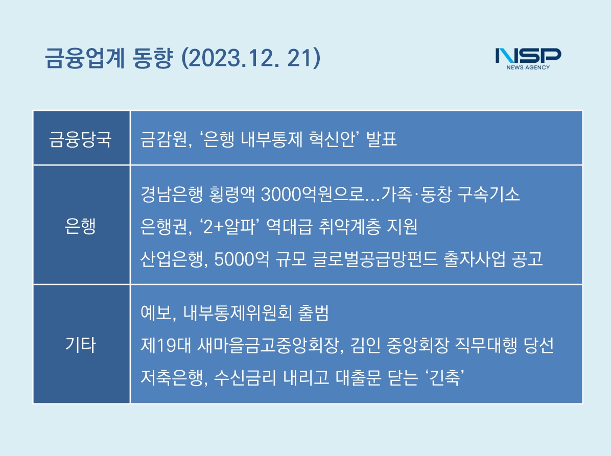 (서울=NSP통신) 강수인 기자 = 지난해부터 대형 횡령사고, 계좌 무단 개설 등 금융사고가 이어진 가운데 금융당국은 은행권의 내부통제 혁신방안 개선안을 발표했다. 또 은행권은 ‘2조+알파’로 역대 최대 규모인 상생금융 보따리를 푼다. 은행별로 당기순이익 순으로 지원금을 분배해 부담하게 된다.