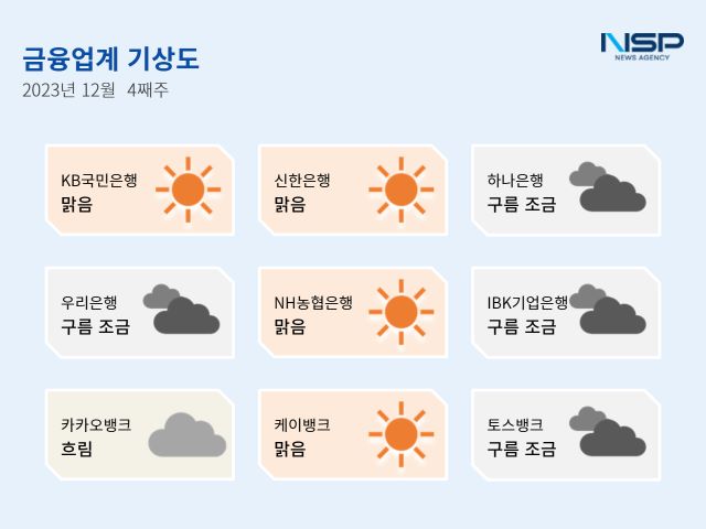 (서울=NSP통신) 강수인 기자 = 2023년 12월 4주차 금융업계기상도는 KB국민은행·신한은행·NH농협은행·케이뱅크의 ‘맑음’, 하나은행·우리은행·IBK기업은행·토스뱅크의 ‘구름조금’, 카카오뱅크의 ‘흐림’으로 기록됐다.