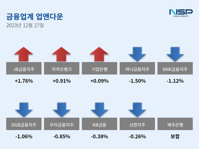 (서울=NSP통신) 강수인 기자 = 27일 코스피(+0.47%)와 코스닥(+1.35%)은 모두 상승했다. 이 가운데 은행주는 전거래일 대비 0.30% 내렸다. 은행주는 11종목 가운데 3종목이 상승, 7종목이 하락했다. 보합세는 2종목이다.
