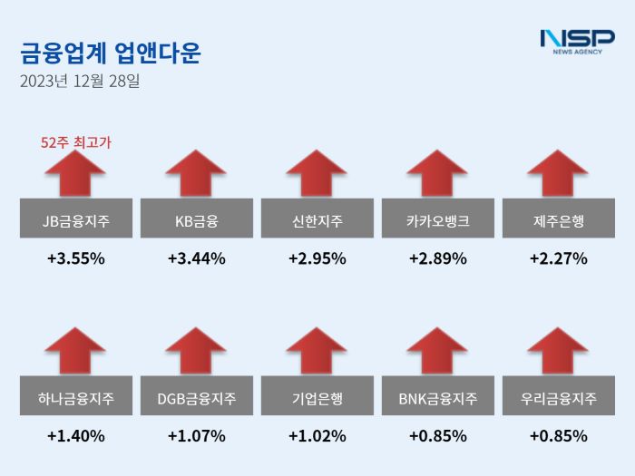 가장 큰 상승률을 보인 종목은 JB금융지주로 이날 52주 최고가(1만1470원)을 기록하기도 했다. JB금융지주는 전거래일 대비 3.55%(390원) 올라 1만1390원으로 장을 마쳤다.
