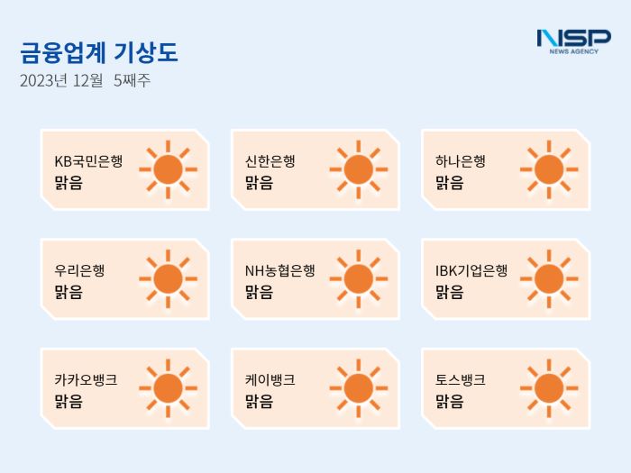(서울=NSP통신) 강수인 기자 = 2023년 12월 5주차 금융업계 기상도는 KB국민은행·신한은행·하나은행·우리은행·NH농협은행·IBK기업은행·카카오뱅크·케이뱅크·토스뱅크의 ‘맑음’으로 기록됐다.