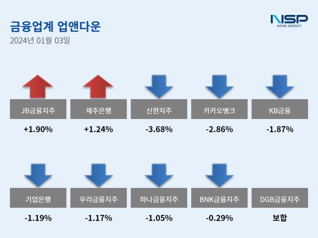 가장 큰 상승률을 보인 종목은 JB금융지주다. JB금융지주는 전거래일 대비 1.90%(210원) 올라 1만1280원으로 장을 마쳤다.