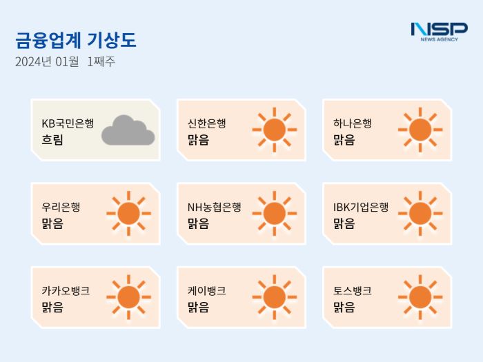 (서울=NSP통신) 강수인 기자 = 2024년 1월 1주차 금융업계기상도는 신한은행·하나은행·우리은행·NH농협은행·IBK기업은행·카카오뱅크·케이뱅크·토스뱅크의 ‘맑음’, KB국민은행의 ‘흐림’으로 기록됐다.