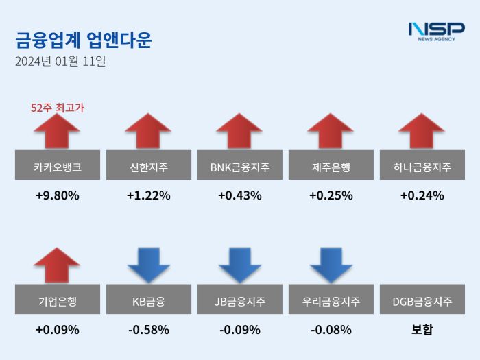 (서울=NSP통신) 강수인 기자 = 11일 코스피(-0.07%)와 코스닥(+0.81%)은 하락과 상승이 엇갈렸다. 이 가운데 은행주는 전거래일 대비 1.70% 상승했다. 은행주는 11종목 가운데 6종목이 상승, 3종목이 하락했다. 2종목은 보합세를 유지했다.