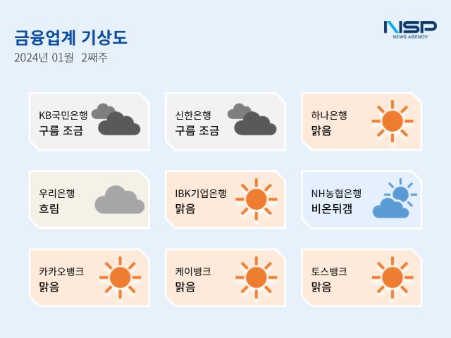 (서울=NSP통신) 강수인 기자 = 2024년 1월 2주차 금융업계기상도는 하나은행·IBK기업은행·카카오뱅크·케이뱅크·토스뱅크의 ‘맑음’, KB국민은행·신한은행의 ‘구름조금’, 우리은행의 ‘흐림’, NH농협은행의 ‘비온뒤갬’으로 기록됐다.