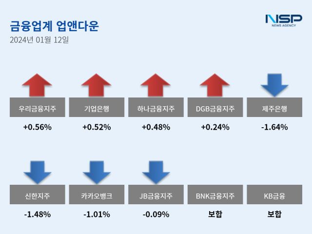 (서울=NSP통신) 강수인 기자 = 12일 코스피(-0.60%)와 코스닥(-1.64%)은 모두 하락했다. 이 가운데 은행주는 전거래일 대비 0.29% 하락했다. 은행주는 11종목 가운데 4종목이 상승, 5종목이 하락했다. 보합세는 2종목이다.