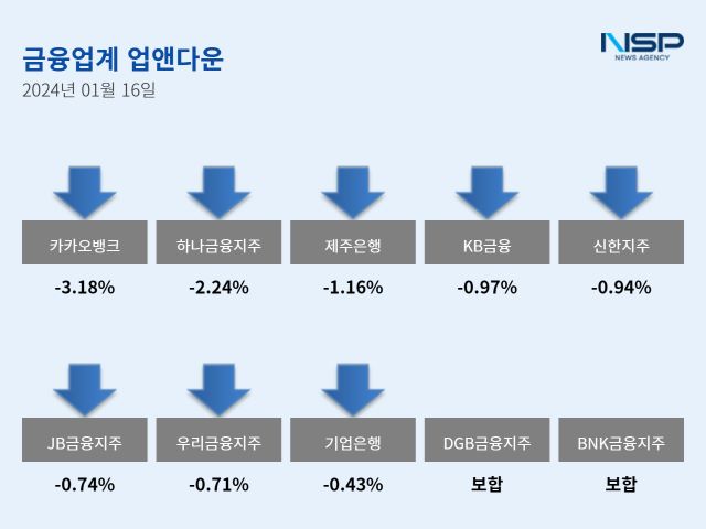 (서울=NSP통신) 강수인 기자 = 16일 코스피(-1.12%)와 코스닥(-0.57%)은 모두 하락했다. 이 가운데 은행주는 전거래일 대비 1.36% 하락했다. 은행주는 11종목 가운데 9종목이 하락했다. 보합세는 2종목이다.