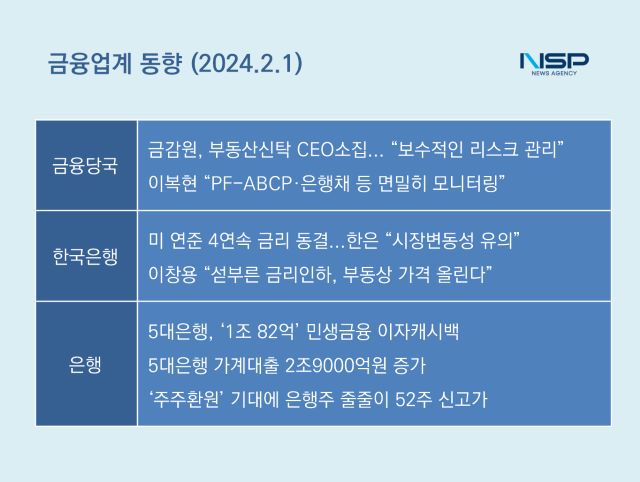 (서울=NSP통신) 강수인 기자 = 시장의 기대와는 달리 미국 연방준비제도(연준)는 금리를 5.25~5.50% 수준으로 동결했다. 오는 3월 금리인하 가능성에 대해서도 선을 그었다. 한편 정부의 코리아디스카운트 해소 정책으로 주주환원에 대한 기대가 모아짐에 따라 은행주가 줄줄이 52주 신고가를 기록했다.