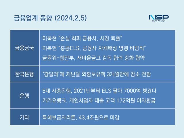 (서울=NSP통신) 강수인 기자 = 이복현 금융감독원장이 고객 이익을 외면하고 손실을 회피하는 금융사를 퇴출할 것이라는 강력한 경고메시지를 전했다. 금감원은 설 연휴가 끝나고 ELS(주가연계증권) 관련 2차 검사에 나설 계획이다.