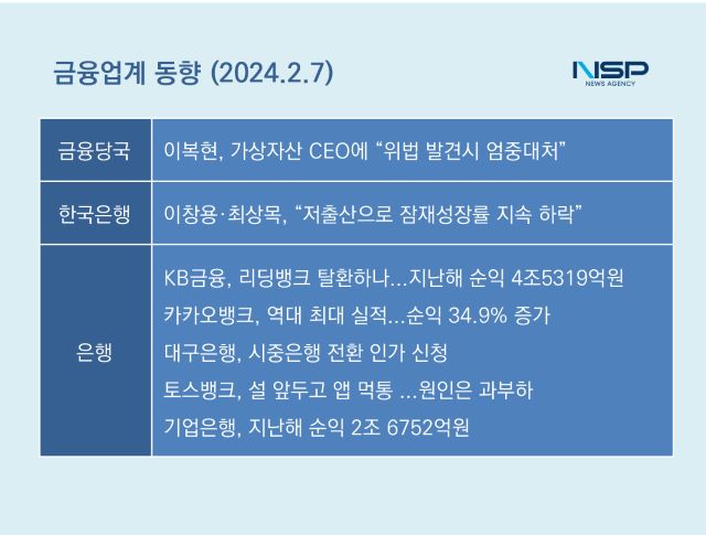 (서울=NSP통신) 강수인 기자 = 지난해 금융사들의 연간 실적이 연이어 발표되고 있는 가운데 KB금융그룹은 신한금융지주로부터 1위 타이틀을 다시 가져올 수 있을 것으로 전망된다. 한편 DGB금융그룹은 예비인가 절차를 뛰어넘고 바로 대구은행의 본인가를 신청했다.