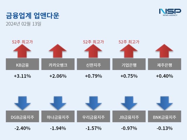 (서울=NSP통신) 강수인 기자 = 13일 코스피(+1.30%)와 코스닥(+0.61%)은 모두 상승했다. 이 가운데 은행주는 전거래일 대비 1.97% 상승했다. 은행주는 11종목 가운데 8종목이 상승하고 3종목이 하락했다.