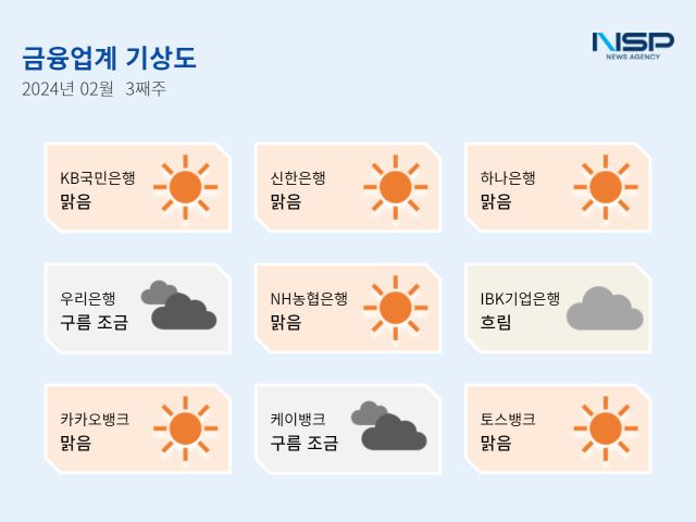 (서울=NSP통신) 강수인 기자 = 2024년 2월 3주차 금융업계기상도는 KB국민은행·신한은행·하나은행·NH농협은행·카카오뱅크·토스뱅크의 ‘맑음’, 우리은행·케이뱅크의 ‘구름조금’, IBK기업은행의 ‘흐림’으로 기록됐다.