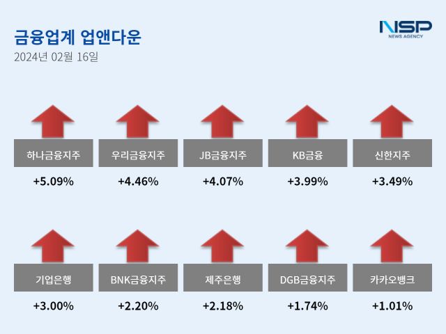 (서울=NSP통신) 강수인 기자 = 16일 코스피(+1.34%)와 코스닥(+1.23%)은 모두 상승했다. 이 가운데 은행주는 전거래일 대비 3.52% 상승했다. 은행주는 11종목 가운데 10종목이 상승하고 1종목이 하락했다.