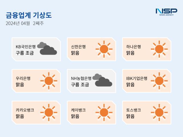 (서울=NSP통신) 강수인 기자 = 2024년 4월 12일 금융업계기상도는 신한은행·하나은행·우리은행·NH농협은행·IBK기업은행·카카오뱅크·케이뱅크·토스뱅크의 ‘맑음’, KB국민은행·NH농협은행의 ‘구름조금’으로 기록됐다.