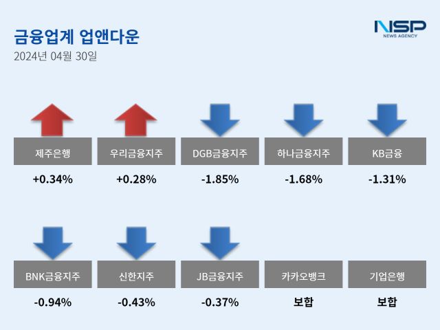 (서울=NSP통신) 강수인 기자 = 30일 코스피(+0.17%)와 코스닥(-0.09%)은 상승과 하락이 엇갈렸다. 이 가운데 은행주는 전거래일 대비 0.73% 하락했다. 은행주는 11종목 가운데 2종목이 상승, 7종목이 하락했다. 2종목은 보합세를 유지했다.