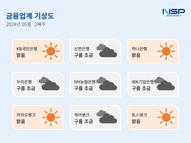 (서울=NSP통신) 강수인 기자 = 2024년 5월 2주차 금융업계기상도는 KB국민은행·하나은행·카카오뱅크·토스뱅크의 ‘맑음’, 신한은행·우리은행·NH농협은행·IBK기업은행의 ‘구름조금’으로 기록됐다.