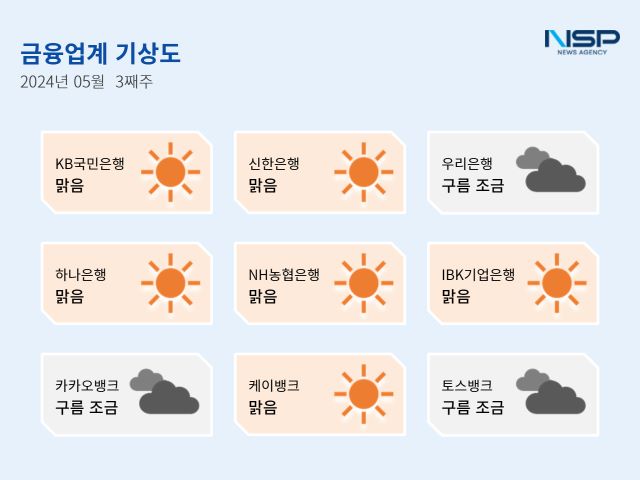 (서울=NSP통신) 강수인 기자 = 2024년 5월 3주차 금융업계기상도는 KB국민은행·신한은행·하나은행·NH농협은행·IBK기업은행·케이뱅크의 ‘맑음’, 우리은행·카카오뱅크·토스뱅크의 ‘구름조금’으로 기록됐다.
