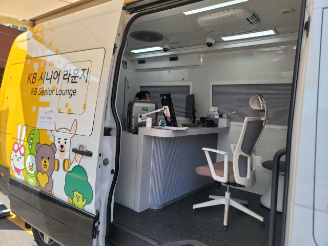 KB국민은행은 별도의 특화점포를 마련하기 보다 차량의 구조를 변경해 복지관으로 직접 찾아가는 ‘KB시니어라운지’를 운영하고 있다. 대형 벤 내부를 1인용 은행 창구로 만든 이동식 점포다. 정해진 요일에 서울 노원구, 중랑구, 은평구 등 노인복지기관으로 방문한다.