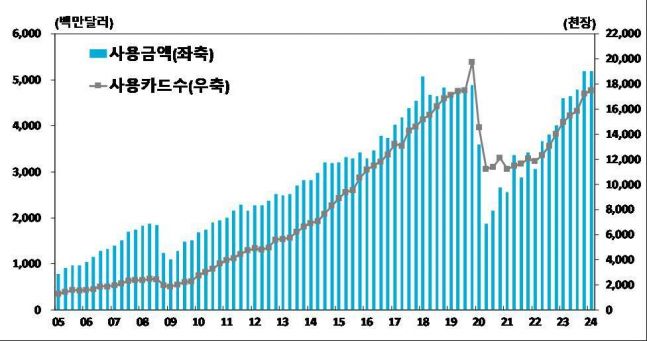이에 따라 해외 카드결제 금액도 증가했다. 한국은행에 따르면 지난 1분기 거주자의 카드(신용·체크·직불) 해외 사용 금액은 51억 8000만달러(7조 1566억 8800만원)로 전년 동기 대비 12.6% 증가했다. 이는 1분기 기준으로 사상 최대치다.