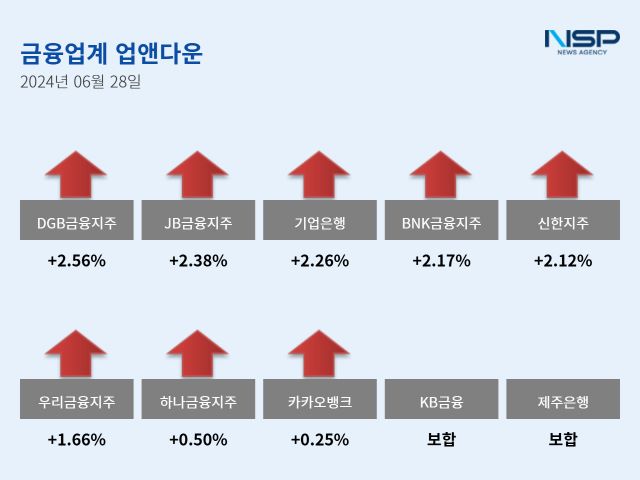 (서울=NSP통신) 강수인 기자 = 28일 코스피(+0.49%)와 코스닥(+0.21%)은 모두 상승했다. 이 가운데 은행주는 전거래일 대비 1.09% 상승했다. 은행주는 11종목 가운데 9종목이 상승했다. 보합세는 2종목이다.