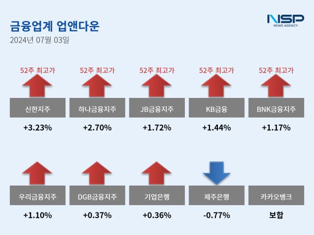 이날 신한지주, 하나금융지주, JB금융지주, KB금융, BNK금융지주는 52주 신고가를 경신했다.