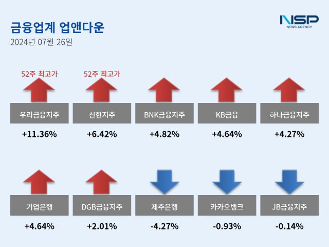 (서울=NSP통신) 강수인 기자 = 26일 코스피(+0.78%)와 코스닥(+0.03%)은 모두 상승했다. 이 가운데 은행주는 전거래일 대비 4.89% 상승했다. 은행주는 11종목 가운데 7종목이 상승, 4종목이 하락했다.