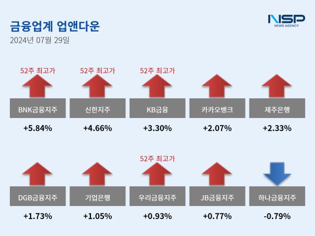 (서울=NSP통신) 강수인 기자 = 29일 코스피(+1.23%)와 코스닥(+1.31%)은 모두 상승했다. 이 가운데 은행주는 전거래일 대비 4.89% 상승했다. 은행주는 11종목 가운데 10종목이 상승, 1종목이 하락했다.