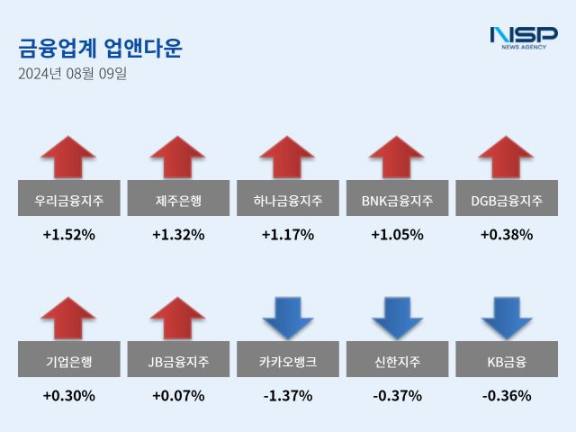 (서울=NSP통신) 강수인 기자 = 9일 코스피(+1.24%)와 코스닥(+2.57%)은 모두 상승했다. 이 가운데 은행주는 전거래일 대비 0.07% 상승했다. 은행주는 11종목 가운데 7종목이 상승, 4종목이 하락했다.