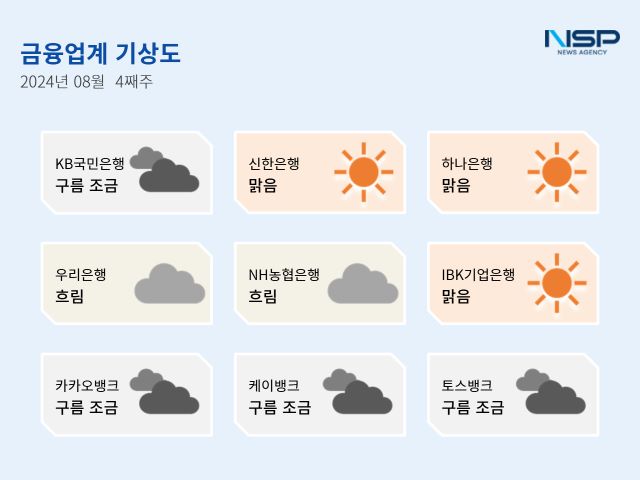 (서울=NSP통신) 강수인 기자 = 2024년 8월 4주차 금융업계기상도는 신한은행·하나은행·IBK기업은행의 ‘맑음’, KB국민은행·카카오뱅크·케이뱅크·토스뱅크의 ‘구름조금’, 우리은행·NH농협은행의 ‘흐림’으로 기록됐다.