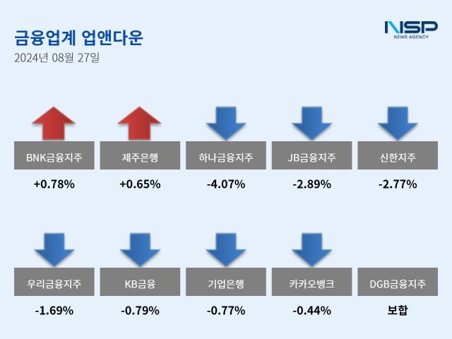 (서울=NSP통신) 강수인 기자 = 27일 코스피(-0.32%)와 코스닥(-0.24%)은 모두 하락했다. 이 가운데 은행주는 전거래일 대비 1.81% 하락했다. 은행주는 11종목 가운데 2종목이 상승, 8종목이 하락했다. 보합세는 1종목이다.