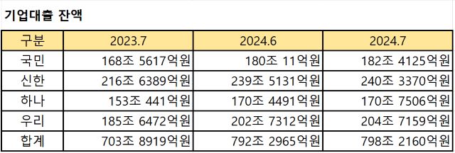 28일 금융권에 따르면 4대 시중은행(KB국민·신한·하나·우리)의 지난 7월말 기준 기업대출 잔액은 798조 2160억원으로 전년 동월 대비 13% 증가했다. 은행 전체로 확대하면 기업대출 잔액은 1304조 7000억원으로 전월 대비 7조 8000억원 증가했다.
