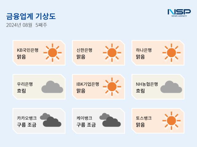 (서울=NSP통신) 강수인 기자 = 2024년 8월 5주차 금융업계기상도는 KB국민은행ㄹ·신한은행·하나은행·IBK기업은행·토스뱅크의 ‘맑음’, 카카오뱅크·케이뱅크의 ‘구름조금’, 우리은행·NH농협은행의 ‘흐림’으로 기록됐다.