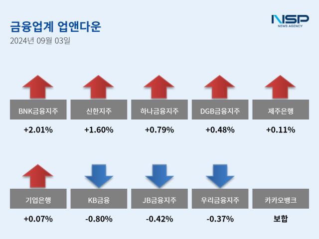 (서울=NSP통신) 강수인 기자 = 3일 코스피(-0.61%)와 코스닥(-1.15%)은 모두 하락했다. 이 가운데 은행주는 전거래일 대비 0.28% 상승했다. 은행주는 11종목 가운데 6종목이 상승, 4종목이 하락했다. 보합세는 1종목이다.