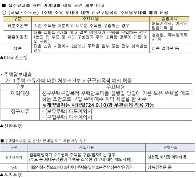 KB국민은행도 지난 10일 실수요자 보호를 위한 대출 취급 예외 조건을 재안내했다. 서울·수도권 1주택 소유 세대 중 기존주택을 처분한 경우나 결혼예정자, 상속 등 신규구입목적 주담대에는 예외를 적용했다. 우리은행도 지난 8일 결혼, 상속 등 예외 조건을 발표했다.
