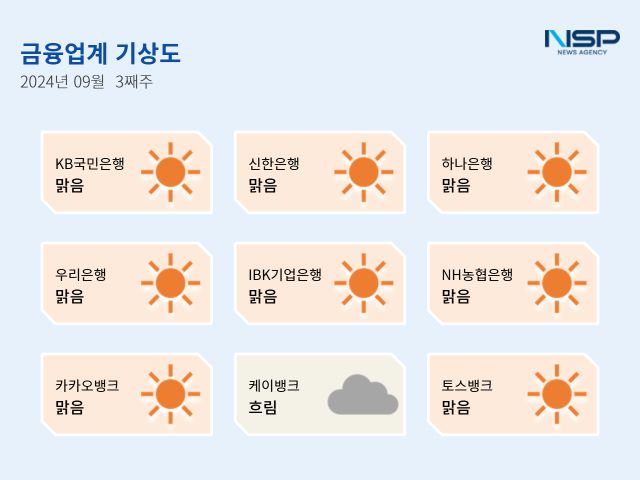 (서울=NSP통신) 강수인 기자 = 2024년 9월 3주차 금융업계기상도는 KB국민은행·신한은행·하나은행·IBK기업은행·NH농협은행·카카오뱅크·토스뱅크의 ‘맑음’, 케이뱅크의 ‘흐림’으로 기록됐다.