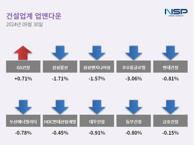 주요 종목 위주로 살펴보면 이날 상승률을 기록한 종목은 GS건설뿐이다. GS건설은 전일 대비 0.71%(130원) 상승해 1만8340원으로 장을 마쳤다.
