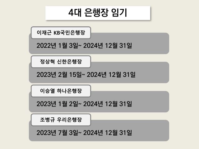 이재근 KB국민은행장, 정상혁 신한은행장, 이승열 하나은행장, 조병규 우리은행장 등 4대 은행장의 임기가 오는 연말 종료된다. 통상 행장의 임기는 기본 2년에 추가로 1년을 더한 ‘2+1’로 3년의 임기가 주어지지만 올해는 규모가 큰 금융사고가 잦아 연임 여부에 관심이 모아진다.