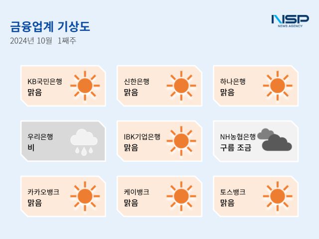 (서울=NSP통신) 강수인 기자 = 2024년 10월 1주차 금융업계기상도는 KB국민은행·신한은행·하나은행·IBK기업은행·카카오뱅크·케이뱅크·토스뱅크의 ‘맑음’, NH농협은행의 ‘구름조금’, 우리은행의 ‘비’로 기록됐다.