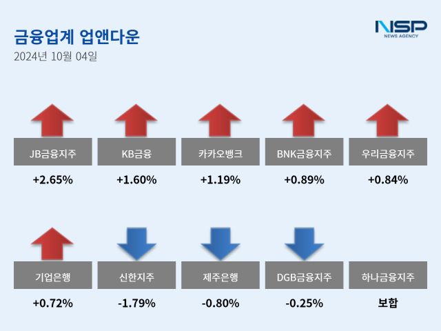 (서울=NSP통신) 강수인 기자 = 4일 코스피(+0.31%)와 코스닥(+0.90%)은 모두 상승했다. 이 가운데 은행주는 전거래일 대비 0.35% 상승했다. 은행주는 11종목 가운데 6종목이 상승, 4종목이 하락했다. 보합세는 1종목이다.