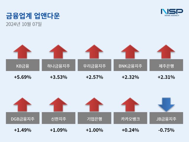 (서울=NSP통신) 강수인 기자 = 7일 코스피(+1.58%)와 코스닥(+1.56%)은 모두 상승했다. 이 가운데 은행주는 전거래일 대비 2.80% 상승했다. 은행주는 11종목 모두 상승했다.