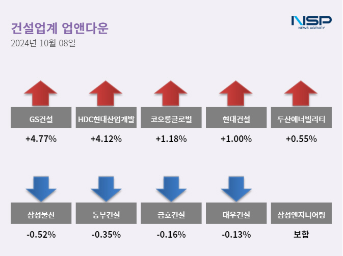 반면 하락률은 삼성물산 -0.52%(700원), 동부건설 -0.35%(15원), 금호건설 -0.16%(5원), 대우건설 -0.13%(5원) 순이다.