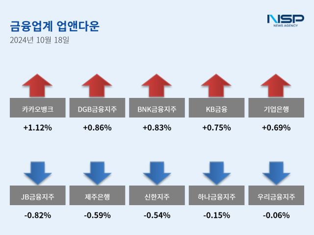 (서울=NSP통신) 강수인 기자 = 18일 코스피(-0.59%)와 코스닥(-1.55%)은 모두 하락했다. 이 가운데 은행주는 전거래일 대비 0.23% 상승했다. 은행주는 11종목 가운데 5종목이 상승, 6종목이 하락했다.
